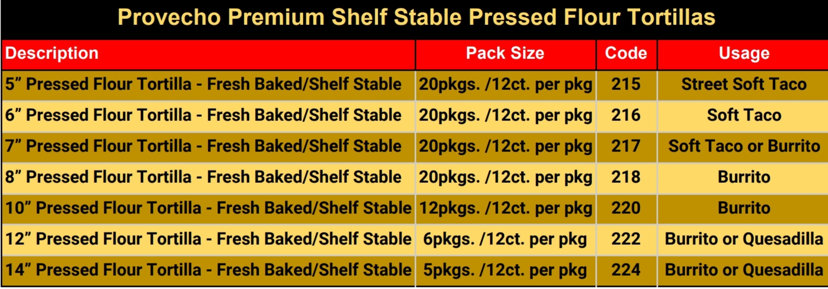 La Chiquita manufactures the best flour tortilla on the market. We offer hot pressed flour tortillas that are thick and pliable without compromising the durability of the tortilla. This creates a soft tortilla that will resist breakage and tearing to increase yields of tortillas in your kitchen. These are perfect for burritos, soft tacos, quesadillas and so much more. Our Premium flour tortillas are baked and shipped frozen to lock in freshness. Provecho Flour tortillas are avalaible to fit all of your shelf stable flour tortilla needs.