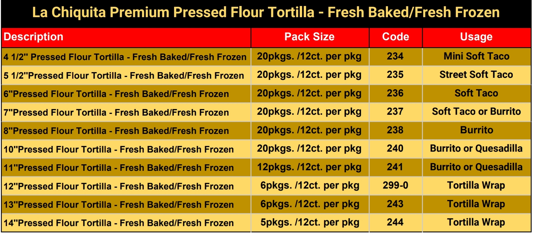 Versatility is what makes La Chiquita’s flour line of tortillas so special. Choose from a variety of sizes, colors and flavors to fit your needs. Sizes and pressed tortillas range from 4" to 14".
